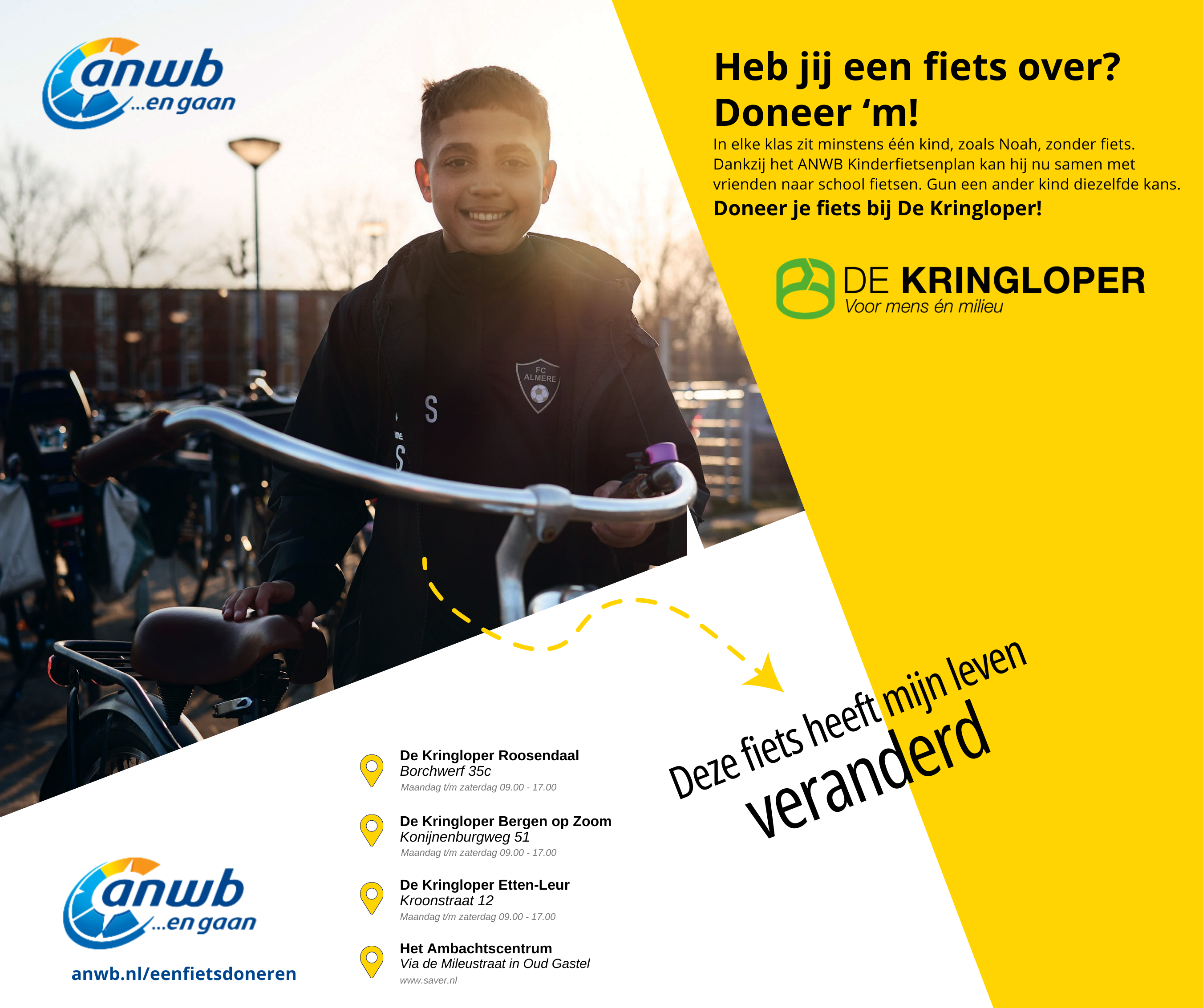 In elke klas zit minstens één kind zonder fiets. Dit zijn ruim 85.000 kinderen in Nederland. Het ANWB Kinderfietsenplan vindt dat ieder kind recht heeft op een fiets, om op die manier mee te kunnen doen in de samenleving. Daarom zamelen we (alle maten) fietsen in, knappen ze op en zorgen dat ze bij kinderen tussen de 6 en 18 jaar terechtkomen die geen eigen fiets hebben.