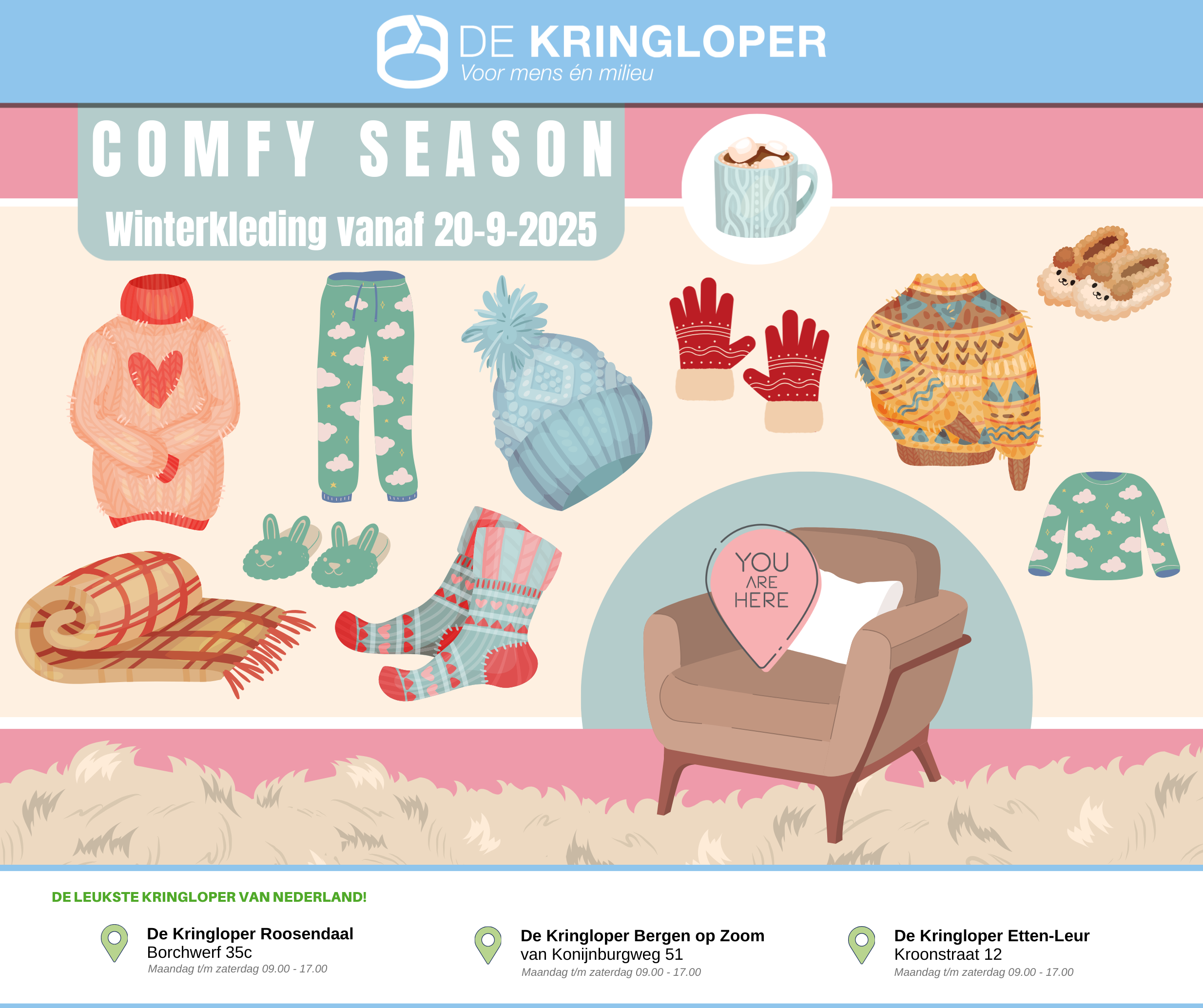 Kom gezellig langs tijdens Comfy season! De Kringloper heeft je cozy outfit klaarhangen. 😍